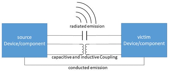 For coupling mechanisms, the distinction of the field regions between reactive and radiative field components is essential. According to Figure 2, for electromagnetic interference (EMI), three kinds of electromagnetic coupling to neighboring elements are defined: radiated, conducting, and reactive interference. The last include inductive and capacitive effects [2]. Conductive interference is an effect based on galvanically coupled elements. As this work focuses on coupling through the air interface, these effects are not discussed in detail.