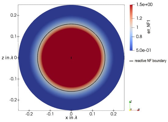 In Figure 4, the error estimator for the NF, introduced in 9, applied on the HD is shown. It can be seen that the condition for the NF boundary stated in 10 is exactly met at the distance and shapes an exact sphere. With the modified error-estimator in 11, the same result would be present. This can also be derived by setting the real part of the radial component of the Poynting vector equal to the imaginary part of the radial component in 13.