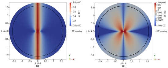 Figure 5a shows the error estimator 5, describing the FF error around an HD. It can be seen that 5 is not applicable for solid angles, where the directivity , respectively, the real parts of , are zero. Consequently, 6 has been introduced, weighting 5 with the directivity to obtain a qualitative measure of the FF behavior. Examining Figure 5b, where the error-estimator 6 is applied on an HD, shows that the most significant error is made in regions between nulls and maximums of the directivity pattern. It can also be seen that the proposed FF boundary fits quite well for this kind of antenna, as the reactive power flow decayed and no transversal field components of the radiating part are present on the sphere’s surface.