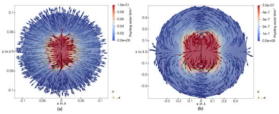 In Figure 6, the real part (a) and the imaginary part (b) of the Poynting vector around a dipole is shown. Compared to the power flow of the HD in Figure 3, it can be seen that the real part has radial components and tangential components. The time-averaged power flow is almost normal to the antenna orientation near the antenna. However, this changes to the radial direction at a very short distance to the antenna. Hence, practically no transition zone is observable. For the imaginary part of the Poynting vector, thus, the oscillating part of the power flow, no qualitative difference is noticeable compared to the HD, and the same kidney shape of the magnitude is shown.