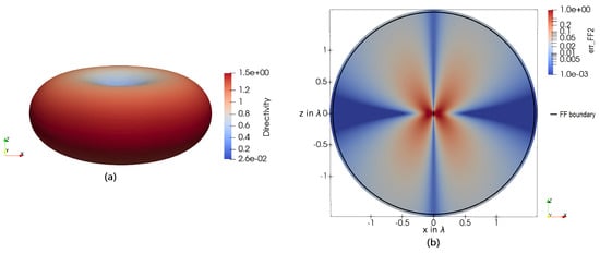 Figure 7 shows the directivity (a) and the FF error-estimator 6 for a dipole antenna. For very small dipoles, such as the dipole, the directivity pattern and the maximum directivity are the same as for the HD [13] (p. 167). Additionally, the FF error behaves the same as for the HD. Hence, the FF boundary of fits well. The major errors are again made between the null and the lobe due to oscillating power flow.