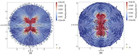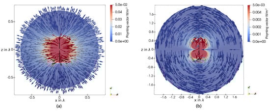 Figure 10 denotes the real part (a) and the imaginary part (b) of the Poynting vector around a dipole. From the real part, it can clearly be seen that the radiative power is flowing in different angular directions; hence, this antenna has not only one lobe. This again can be explained from transmission line theory, as the standing wave on the dipole has more than one maximum. A time-average power flow is observable between the lobes in the -direction, predominately towards the main lobe in the -direction. Consequently, here, the transition zone is more pronounced.