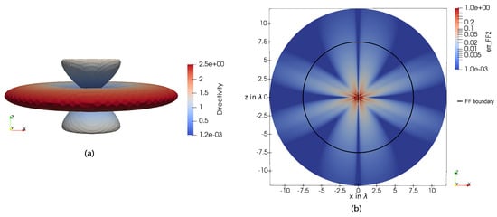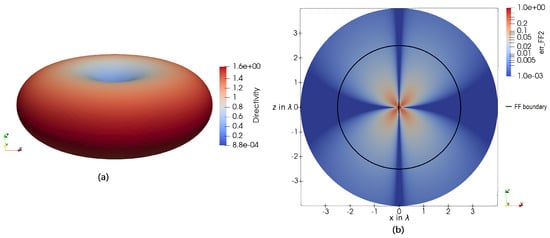 In Figure 11, the directivity (a) and the FF error (b) are shown for a dipole. It can be seen that, again, between lobes and nulls, the highest error arises. For larger antenna structures, such as that shown here, this is due to radiating field parts flowing in the tangential direction to the sphere’s surface, as shown in Figure 10a. The area where this happens is called the transition zone. Here, the FF error is relatively low at the literature’s proposed FF boundary. Hence, this can be seen as slightly overestimated.