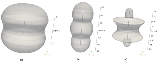 Figure 12c shows the reactive NF region of a dipole. Again, around the feeding structure and the end positions of the antenna, spherical structures can be observed. At an angle of about , a dent of the reactive NF region can be seen. This can be explained due to the low radiating power flow between the two lobes of the directivity pattern; hence, the reactive parts dominate for a longer distance.