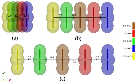 The three investigated linear antenna arrays, each consisting of five -dipoles. The distance between these array elements is (a) , (b) , and (c) . The reactive NF region, proposed in Figure 12b, is shown around each dipole.