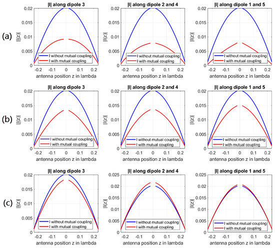 The current distribution along the different dipoles for the array with (a) spacing, (b) spacing, and (c) spacing between each element. For the blue curve, each element has been computed separately, hence mutual coupling effects were not considered. For the red curve, the elements have been computed as an array; consequently, mutual coupling effects have been considered.