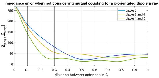 Figure 15 shows the impedance differences between the two methodologies of computing the array for each dipole. At a distance smaller than , where the reactive NF regions of the elements are overlapping, a significant impact on the impedance due to coupling effects can be seen. Above the distance of , still, a deviation is observable due to radiative coupling effects, as the elements are inside the main lobe of the directivity of the other elements. Finally, at an element distance of more than , a maximum at multiples of half the wavelength can be seen, which can be explained by resonance effects that occur between the elements.