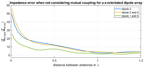This section analyzes a linear antenna array regarding the coupling behavior between the single elements. As shown in Figure 13, the array consists of five z-orientated dipoles equally spaced in the x-direction. All dipoles are excited with and no phase shift between the elements. To analyze the coupling behavior, the setting is analyzed in two ways. First, every element is computed separately using PEEC. The evaluated current on each dipole can later be used as a source to calculate a single element’s electromagnetic field. Using the pattern multiplication technique [13] (p. 286), the field of the array can later be evaluated by superposing the field parts of the single elements. As the dipoles are computed separately, no mutual coupling effects between the dipole elements are considered. Second, the array is solved at once, also using PEEC. Within this, the coupling behavior between the elements is considered. To obtain a quantitative measure of the coupling behavior, the currents of the single elements are compared. Additionally, the difference in the single elements’ impedance using the first proposed simulation method and the second one is made and visualized.
