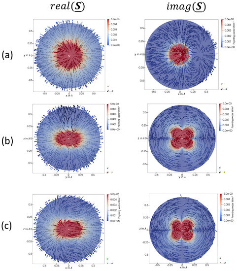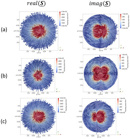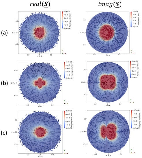 In Figure 17, the real part and the imaginary part of the Poynting vector in the coordinate planes around a loop antenna are shown. As seen in the xy-plane in Figure 17a, the real part of the Poynting vector also has non-radial parts. Hence, a transition zone can be observed. For higher distances to the antenna origin, these non-radial components vanish, and a rotationally symmetrical behavior can be observed in the xy-plane. In the xz-plane in Figure 17c, a net power flow in the -direction around the antenna can be seen. This power flow is directed from the direction to the direction. Again, this non-radial net power flow vanishes at higher distances, and pure radial components can be seen. The same occurs for the magnetic dipole; for the angles and , the real part of the energy flow vanishes at higher distances. Consequently, a donut-shaped directivity pattern can be expected.