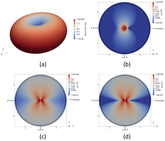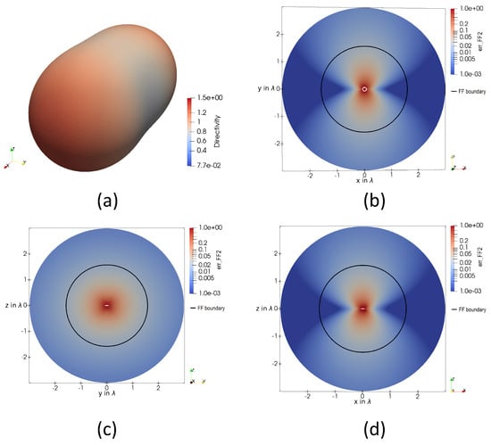 Figure 22 shows the directivity (a) and the FF error-estimator 6 in the xy-plane (b), yz-plane (c), and zx-plane (d) for a loop antenna with the circumference of . The directivity in Figure 22a differs essentially from an electrically short dipole. The power flow shifted from the y-direction towards the z-direction. Additionally, no null in the directivity pattern is observable. The maxima are located in the positive and negative x-direction. Hence, an almost rotationally symmetrical behavior along the x-axis can be seen. The xy-plane and xz-plane of the error-estimator 6 behave qualitatively the same. In Figure 22c, it can be seen that the maximum error lies in the yz-plane. As for smaller loop antennas or dipole antennas, this is again between two maxima of the directivity pattern. At the FF boundary for small antennas , the error decreased to about 0.01. Hence, the proposed FF boundary can be seen as reliable.