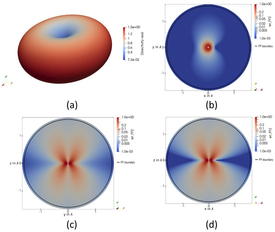 Figure 20 shows the directivity (a) and the FF error-estimator 6 in the xy-plane (b), yz-plane (c), and zx-plane (d) for a loop antenna with the circumference of . No difference can be observed compared to the loop antenna qualitatively. As a circumference of can still be seen as electrically short, the directivity pattern and the maximum directivity are the same.