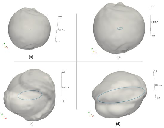 In Figure 23, the proposed reactive NF region is shown for loop antennas with the circumference (a) , (b) , (c) , and (d) . The regions have been derived with the error estimator 11, postulating . Hence, the oscillating power flow normal to the enclosing surface equals the time-averaged power flow.