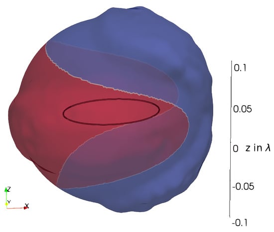 The reactive NF region of a loop antenna with the circumference of , determined by applying the error-estimator in 11, is given. The red surface shows the region where the imaginary part of the normal component of the Poynting vector is positive, and the blue surface shows the region with a negative imaginary part.