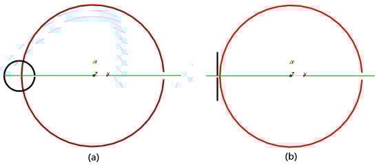 Two main regions can be observed when the loop antenna is electrically large, as for the loop antenna in Figure 23c. One region is around the xy-plane between and for negative x-values. Here, a current maximum on the conducting structure occurs, and following, mainly inductive behavior can be expected. The second region can be seen from to for . As for , the voltage maximum can be observed. This region can be seen as highly capacitive. Still, the overall reactive NF region can be approximated by a sphere with the radius .