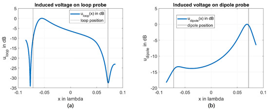 The induced voltage of a loop probe (a) and a dipole probe (b) when moved along the green line denoted in Figure 25 above a loop antenna.