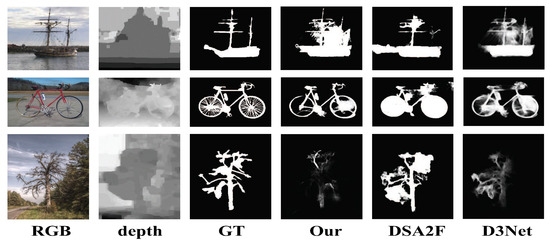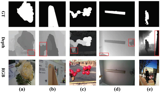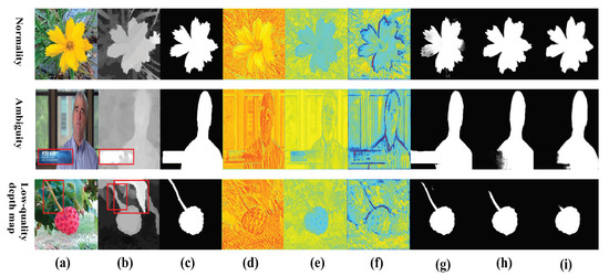 As shown in Figure 4, it can be seen that low-quality depth maps may cause ambiguity between RGB and depth features. The bottom row of Figure 4 is a representative sample, where the red boxes indicate the difference of salient objects. Many existing RGB-D SOD methods (such as ASIFNet [36] and CoNet [36]) fail to obtain correct results due to ignoring the impact of the ambiguity. Unlike them, our method can obtain complete results when encountering the interference of ambiguity and low-quality depth maps. It can be seen that the saliency regions that RGB features and depth features are focused on together are emphasized in Figure 4d–f, which is attributed to the effect of the alternate strategy. Therefore, it is reasonable to think that our method can alleviate the negative effects of depth map degradation.