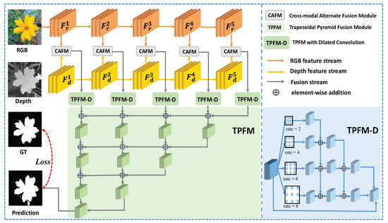 The complete pipeline of the proposed alternate steered attention and trapezoidal pyramid fusion network can be divided into three stages: (1) Two-stream encoders for extracting features, (2) Cross-modal alternate fusion module (CAFM) for multi-modal features, and (3) Trapezoidal pyramid fusion module (TPFM) for multi-scale features, as shown in Figure 2.