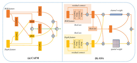 where and represent RGB features and depth features, respectively; means residual convolution as shown in Figure 3b, and indicate the spatial and the channel weights, respectively; is global average pooling operation. ⊙ and ⊕ denote the element-wise multiplication and the element-wise addition, respectively; means the softmax activate function. Finally, the fused feature can be obtained through the ASA mechanism, which can be described as: