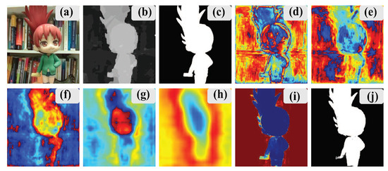 Some visual demonstrations of multi-scale features. The annotations are (a) RGB images, (b) depth maps, (c) ground truth, (d) the fused features in the 1st level, (e) the fused features in the 2nd level, (f) the fused features in the 3rd level, (g) the fused features in the 4th level, (h) the fused features in the 5th level, (i) multi-scale fused features, and (j) the predicted saliency map.