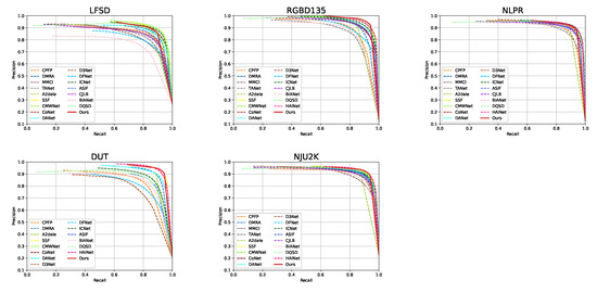Precision–Recall curves of the proposed model and other salient object detection methods on LFSD [37], NLPR [38], DUT [39], NJU2K [40], and RGBD135 [40] datasets.