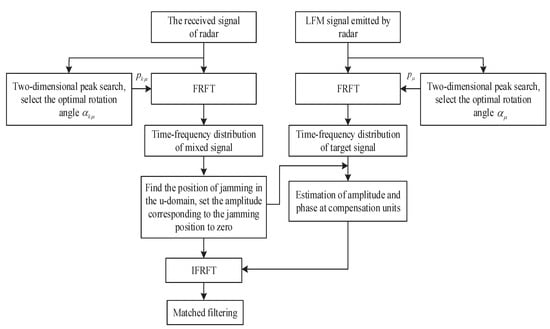 In order to suppress SMSP jamming, the position of SMSP jamming in the u-domain should be estimated first. The transmitting signal is a priori knowledge as far as the radar receiver is concerned, and the rotation angle can be obtained by FRFT to realize the th order FRFT of the LFM signal. The rotation angle obtained by FRFT of the mixed signal can be used to obtain the jamming position because the power of SMSP jamming is much larger than that of the target signal and noise. The flowchart of the SMSP jamming suppression algorithm is shown in Figure 2.