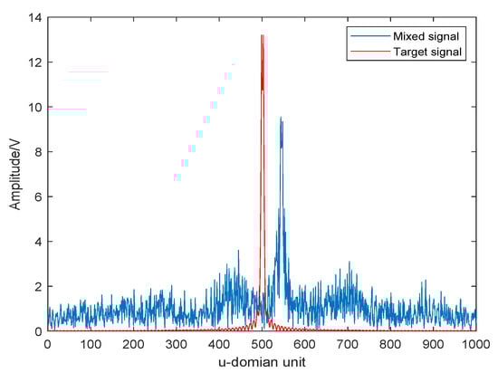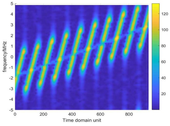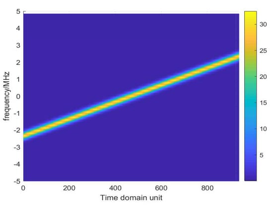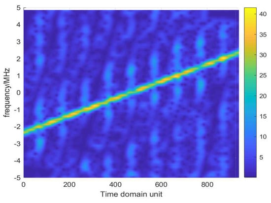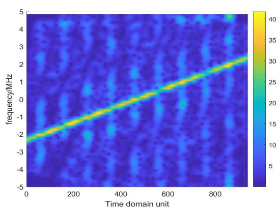 The following is the verification of the algorithm in the presence of Doppler frequency. Figure 16 shows the time-frequency distribution of the mixed signal with Doppler frequency. Compared with Figure 7 without Doppler frequency, the frequency of the mixed signal is shifted upward. Figure 17 shows the u-domain waveforms of the residual signal and the transmitting LFM signal after SMSP jamming was suppressed. Due to the presence of the Doppler frequency, the target signal has an offset in the u-domain. The Doppler frequency can be obtained by using the relationship among the offset, rotation angle and the Doppler frequency.