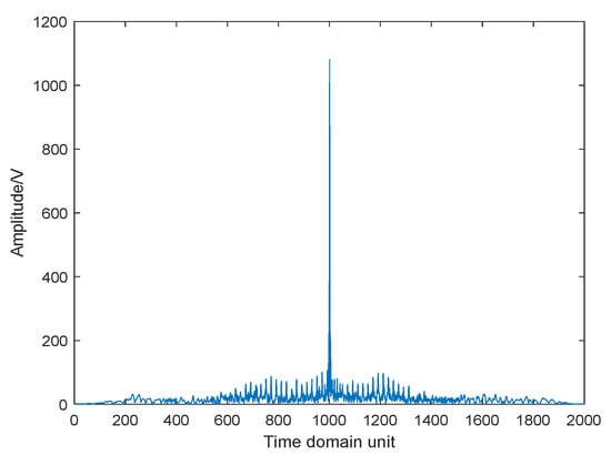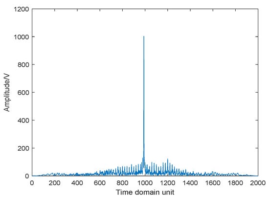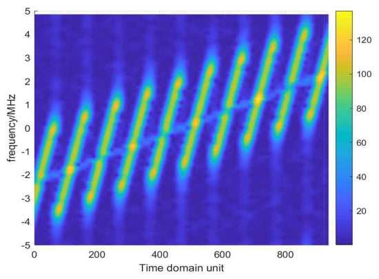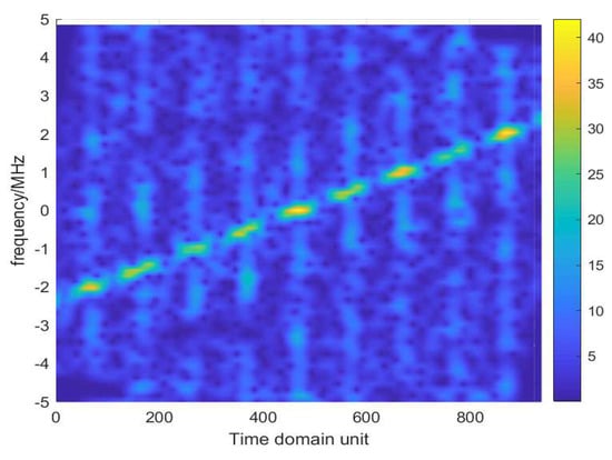 Figure 14 shows the time-frequency distribution of the target signal obtained by the th order IFRFT after the SMSP jamming suppressed in the u-domain. It can be seen that the time-frequency points of the target signal are still retained, which is consistent with the time-frequency distribution of the LFM signal transmitted by the radar in Figure 6. Figure 15 is obtained by matched filtering of the recovered time domain signal. It can be seen that the SMSP jamming is effectively suppressed, and the obtained peak of the target signal has no sidelobe. This shows that this method can effectively suppress SMSP jamming and extract the target signal.