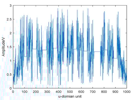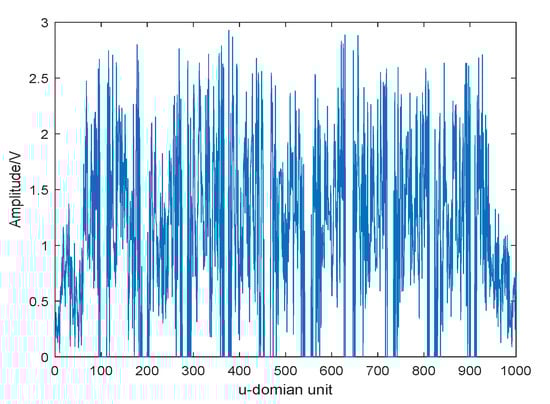 Figure 12 shows the time-frequency distribution characteristic of the residual signal after jamming was suppressed. Because a part of the target signal overlaps with the SMSP jamming in the time-frequency domain, the target signal is also lost while the jamming is completely suppressed, so the time-frequency distribution of the residual target signal is discontinuous. In the u-domain, the signal is compensated at the points where the SMSP jamming set to zero, and the compensated u-domain waveform is shown in Figure 13.