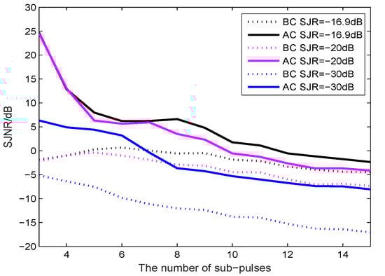 Figure 20 shows the variation of the output SJNR with the number of SMSP jamming sub-pulses. It can be seen that the output SJNR decreases as the number of SMSP jamming sub-pulses increases after the signal compensated. The more the number of sub-pulses, the greater the modulation slope and the greater the loss of the target signal, corresponding to (22). At the same time, it can be seen that the output SJNR without compensation increases and then slowly decreases with the number of sub-pulses, which is mainly due to (22). When the numerator and denominator decrease at the same time and the number of sub-pulses is small, the denominator decreases more than the numerator. As the number of sub-pulses increases, the power loss of the residual target signal is greater, so the output SJNR increases and then decreases. At the same time, it also can be seen that the output SJNR decreases as the input SJR decreases, and when the input SJR is small enough, the output SJNR without compensation always decreases as the number of sub-pulses increases.