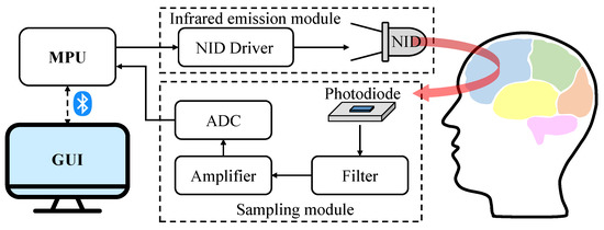 The structure of the fNIRS-based measurement system is shown in Figure 1. The system consists of the micro-processor unit (MPU), infrared emission module, sampling module, Bluetooth transmission module, and graphical user interface (GUI). The infrared emission module is fixed to the forehead of subjects and controls the emission of near-infrared light. Then, the sampling module detects the intensity of the received light. Finally, the blood oxygen saturations at different positions in the PFC are calculated by the MPU. The results will be transmitted to the GUI via Bluetooth.