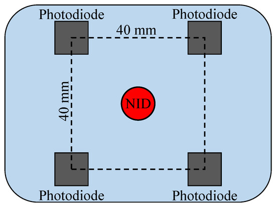 Figure 2 illustrates the distribution of the NID and photodiodes in one probe module. One NID is placed in the center of four photodiodes, and the distance between each NID–photodiode pair is approximately 28 mm. Hence, the near-infrared light can transmit through the deeper tissue layers.