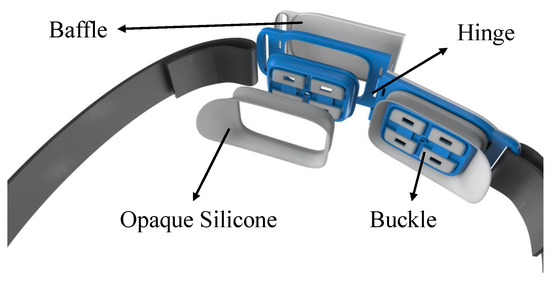As shown in Figure 3, two probe modules are employed in the system, and the distance between the NIDs is approximately 60 mm. To minimize the interference resulting from the environment or movement, it is essential to block out the natural light from the detection area and ensure a tight connection between the sensor and the forehead. In each probe module, a baffle is fixed in the back as a shelter. The connection of probe modules adopts the hinge structure, and silicone is used for the contact between modules and forehead to better fit the various subjects and improve wearing comfort.