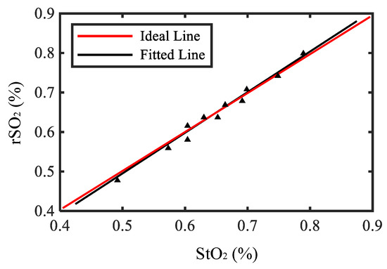 Figure 6 shows the calibration results where the triangles represent the measured values, the red line represents the ideal line, and the black line represents the fitted line. The measurement range of the oxygen saturation is between 0.5–0.75, which is the same as human tissue. The correlation coefficient between the fitted line and ideal line is about 0.98, and the result demonstrates the accuracy of the system.