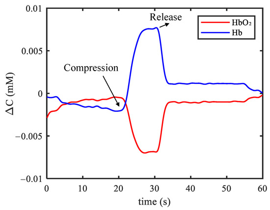 Figure 7 shows one example of the measurement result in the forearm arterial occlusion experiment. At the beginning, the concentrations of HbO and Hb remained stable when the participant stayed relaxed. When the airbag was inflated and the forearm arterial was occluded, blood flow to the forearm was restricted as well as the oxygen. Hence, HbO in the forearm was partially converted into Hb when the oxygen was consumed. Consistently, the measured concentration of HbO increased and the concentration of Hb decreased in Figure 7. After the airbag was released, the two concentrations returned to the normal state.