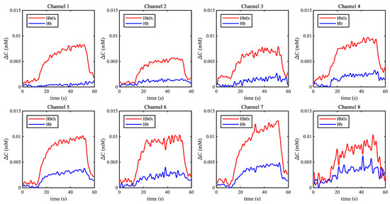 where B is the attenuation of light intensity, and I are the incident light intensity and emitted light intensity, respectively, is the absorption coefficient of the chromophores at a specific wavelength, is the wavelength of the light, and are the concentrations of HbO and Hb, denotes the differential path factor (e.g., 6.53 in our application [18]), r is the distance between light source–detector pairs, and G is a geometry-dependent factor representing the intensity loss caused by scattering. When the concentrations of HbO and Hb change, the attenuation of light intensity changes homogeneously: