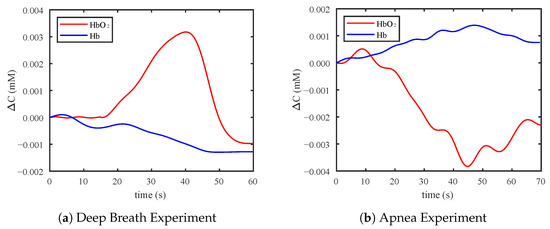 Figure 9a shows one example of the measurement result in the deep breath experiment. The deep breath improved the blood supply to the brain. When the participant started to breathe deeply, the concentration of HbO increased rapidly and the concentration of Hb decreased. Finally, the concentrations returned to the normal level. Figure 9b shows one example of the measurement result in the apnea experiment. Holding breath increased the intrathoracic pressure, resulting in restricted blood flow. When the participant started to hold their breath, the concentration of HbO decreased, and the concentration of Hb had a slight increase as shown in Figure 9. When the participant breathed normally again, the concentrations slowly returned to the normal level.