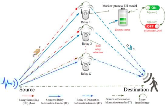 Figure 1 below depicts an LPEH WSN that includes a source (S), an in-between cluster (C) of K cooperative relays , and a destination (D). As investigated in [37,38], this setup is typical and appropriate for studying the impact of RS schemes operating in wireless networks. Additionally, the coverage extension scenario is assumed so that communication between (S) and (D) can be achieved only with the help of the intermediate relays [39,40]. Moreover, the solution can help overcome the deep shadowing effects caused by the movement of humans or obstacles in the surrounding area, making it more suitable for the studied LPEH WSN, [37].