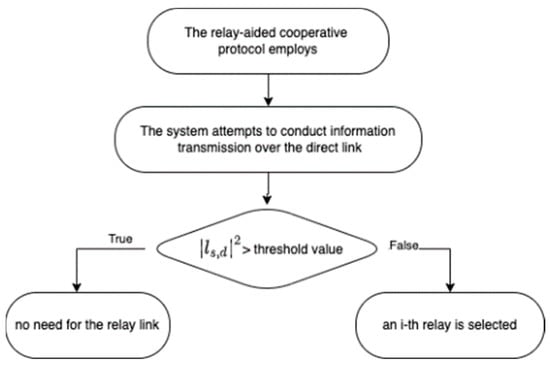 In the context of the relay-aided cooperative protocol, all relay links can alternatively transmit the data in place of the direct link. Specifically, if the direct link is severely attenuated, a relay will be chosen among from the cluster (C) to realize the data transmission alternatively. This is performed on a condition that the relay has a sufficient amount of energy to conduct the task. This process is shown below in Figure 2.