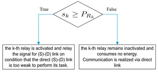 The and the possible energy that can be consumed at are compared to make the decision on whether the transmission should be realized on the direct or the relaying link. This is shown below in Figure 3.
