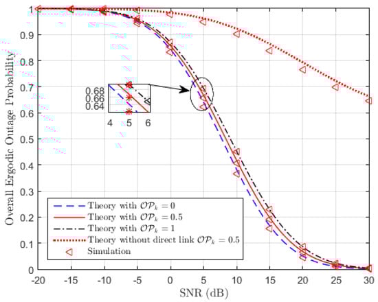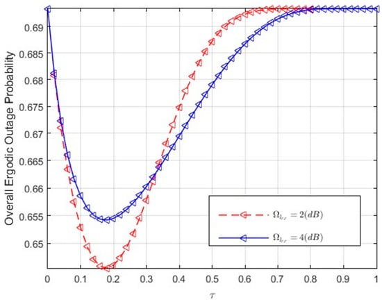 In this section, the Monte Carlo numerical simulation was conducted to investigate the overall ergodic OP of the in-studied system with an optimal RS scheme. In summary, the analytic results were obtained by evaluating the log–normal distribution following [45]. The system parameters for the simulations are listed below in Table 1. The results are calculated based on Proposition 1 in (17), by means of MatLab simulation.