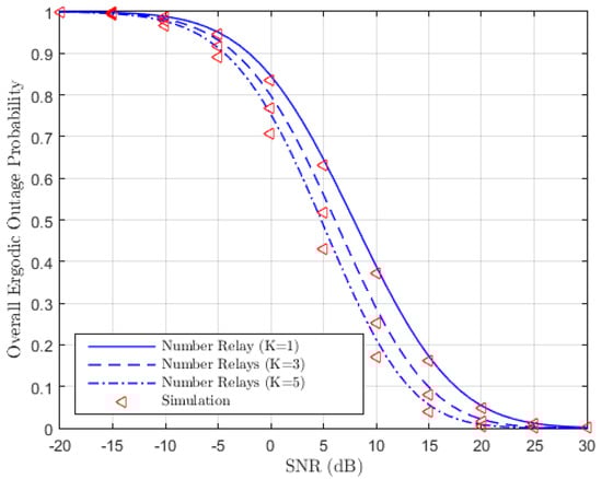 Figure 6 plots the overall ergodic OP versus the SNR when changing the number of relays, , from 1 to 3 and 5. The three curves are simulated with . It is quite intuitive that the more intermediate relays are installed, the lower the overall ergodic OP curve, leading to better system performance. Remarkably, changing the number of relays results in performance curves with similar shapes as changing the value. So far, it can be concluded that the utilization of intermediate EH relays is beneficial for LPEH WSNs with the best RS, and the higher the number of relays, the better the system performs.