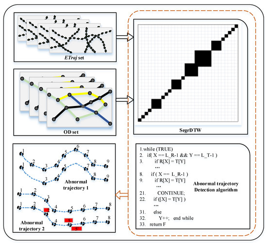 The general framework of the abnormal ETC transaction data detection algorithm is shown in Figure 3. According to the characteristics of , this paper proposes an improved algorithm, SegrDTW, based on DTW. The algorithm matches the similarities of vehicle trajectories passing on path and quickly calculates the unmatched and dissimilar trajectory segments between and through the method of a limited constraint feature window. According to the characteristics of , an abnormal trajectory identification algorithm is designed to identify the missed transactions/false transactions in . The final steps are to map and label these abnormal and verify the missed/false transactions to confirm the accuracy of the results.