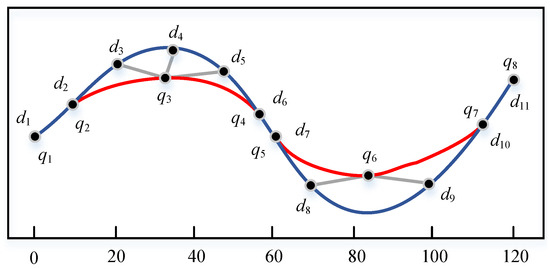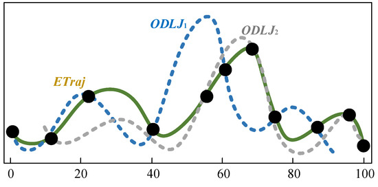 From step 7 to step 18 of the algorithm, we first traverse in the positive and negative directions and use the Euclidean distance ratio to determine the matching feature points. If the match fails, we will confirm whether there are matching points within the range of step size . As shown in Figure 5, and are the trajectory points of and , respectively. The Euclidean distance algorithm is used to calculate the matching trajectory point with in the range of (the orange position point in Figure 5). If there is no matching point in the constraint range of (the green or blue search area in Figure 5), mark and search the trajectory point of to find the matching feature points. The algorithm performs forwards and backwards traversal to ensure that the intermediate data without corresponding relationship can be identified in the matching process and that all the segmented matching points with Euclidean distance equal to 0 in the trajectories of and are obtained. From step 20 to step 25, the algorithm constructs a window according to the identified segmentation matching points as boundaries: