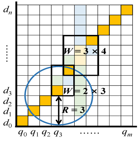 The feature window is constructed as the region between and and the region between and the feature matching points , as shown in Figure 6. After the window is built, the similarity of dynamic path planning can be calculated by the DTW algorithm. The window built by and can be divided into two categories. One is the matching window , that is, Euclidean distance , with time complexity , such as , , and , and the other is the sequence difference window , which has the retrieval distance with two divided matching windows, such as .