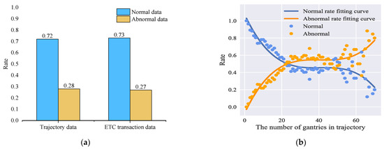 Before verifying our algorithm experiment, the data anomalies of 9,057,200 trading trajectories from 3–12 September 2020 are analyzed by DTW and other algorithms. The data used in the experiment account for 27% of the total data, as shown in Figure 7a. In addition, it is confirmed that there is a correlation between the vehicle journey and the number of gates passing through in the ETC transaction data used. As shown in Figure 7b, when a vehicle passes through more ETC gantries, the error rate of the vehicle’s trajectory will also increase.
