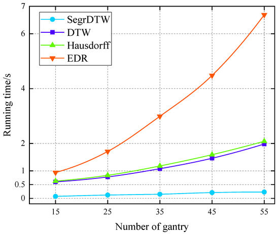 In view of the abnormal feature detection requirements of the ETC transaction data, we also set up a large number of data to verify the processing pressure of the algorithm. Specifically, the data for Quanzhou to Xiamen from September 3 to September 12 were selected for the experiment. The results are shown in Figure 9. The horizontal axis represents the data volume of the 10-day trajectory, and the vertical axis represents the running time. It can be seen from the figure that the running times for the EDR, DTW and Hausdorff algorithms increase exponentially with increasing amounts of trajectory data, which indicates that the amount of data has a great influence on the running time. There is a linear relationship between the running time of the SegrDTW algorithm and the amount of data. As the increase of data volume, the range of change has increased slightly and tends to be stable. This algorithm has strong performance and stable operation. This is because the SegrDTW algorithm greatly increases the proportion of discarding and reducing unnecessary calculations, thus showing the greater compactness of the lower bound. When the spatio-temporal complexity is low, the dissimilar sub-sequences are discarded as early as possible, which reduces the subsequent DTW calculation, so that the retrieval time will not obviously increase with increases in the number.