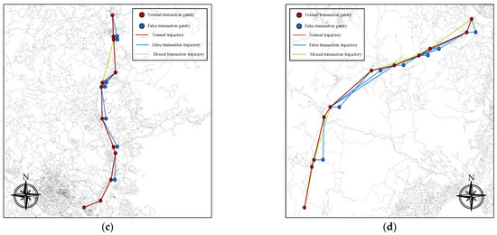 The figures show the driving trajectories of all vehicles passing through the selected four OD paths over three days. The red dot is the ETC gantry on the normal road, while the blue dot is the gantry on the adjacent road. The red trajectory line is the trajectory of the vehicle passing through the correct gantry (overlapping with the ), while the blue and green trajectories are the trajectories of the vehicles with false transactions or missed transactions. The abnormal transaction data account for the total number of trip transactions as shown in Figure 11.