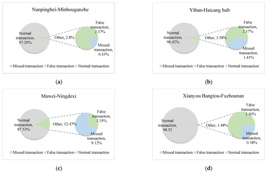 Abnormal transaction ratios of the driving trajectories. (a) The abnormal proportions of missed transactions and false transactions in Nanpingbei-Minhou Ganzhe are 0.43% and 2.37%; (b) The abnormal proportions of missed transactions and false transactions in Yi-ban-Haicang hub are 1.41% and 2.17%; (c) The abnormal proportions of missed transactions and false transactions in Mawei-Ningdexi are 9.12% and 3.35%; (d) The abnormal proportions of missed transactions and false transactions in Xianyou Bangtou-Fuzhounan are 0.38% and 1.10%.