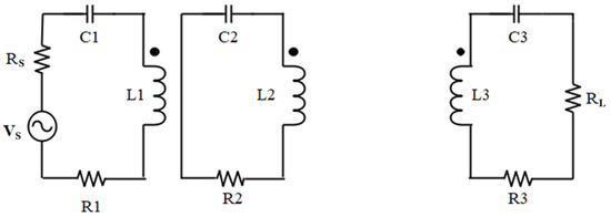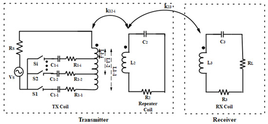 Figure 4 shows a lumped circuit model of the proposed three-coil IPT system. Different turns of the transmitter coil are modeled as , and represents the corresponding winding resistance. Only one switch will be turned on at any time, which means the optimum value of inductance will be chosen for the system at that particular coupling condition. A series-series compensation topology is used in this system. The capacitors represent the external capacitors for different turns of the transmitter coil to operate at the same resonant frequency . The transmitter coil is connected to an AC voltage source . with a source impedance and is inductively coupled to the repeater coil with a coupling coefficient . The and are the self-inductances of the repeater coil and the receiver coil, respectively. The and are the corresponding winding resistances. The and are the external capacitors that tune the coils’ resonant frequency to the resonant frequency of the transmitter coil. The is the coupling coefficient between the repeater coil and the receiver coil. The coupling coefficient k13 between the transmitter coil and the receiver coil is relatively small. Thus, it is neglected in this analysis. A resistive load