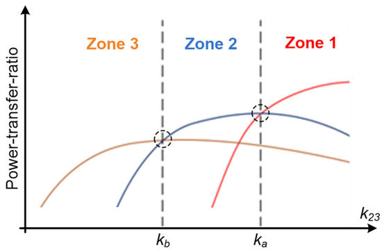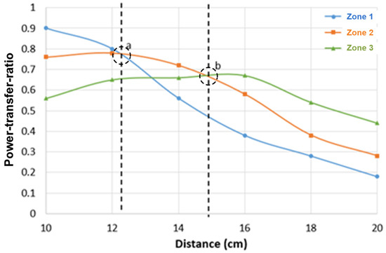 The power-transfer ratio from the transmitter coil to the receiver coil versus transmission distance in three operating zones.